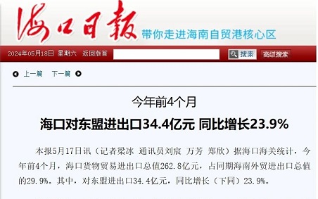 近日,海口日报在“今年前4个月,海口对东盟进出口34.4亿元,同比增长23.9%”的新闻报道中,对mg电玩娱乐在线网址在海口进出...