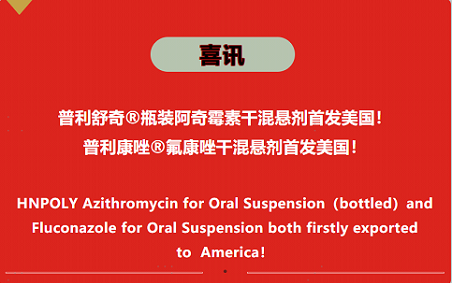 浙江普利(海南普利(300630)全资子公司)制造的阿奇霉素和氟康唑干混悬剂,首发美国