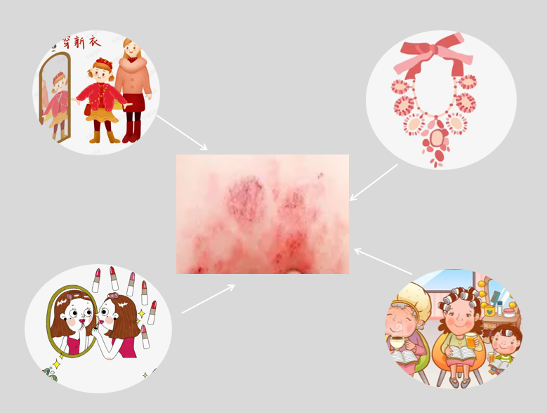 穿新衣,戴新帽,这是每年春节人们都要遵行的一个传统,特别是那些本历年的人,还要穿上大红的内衣、袜子,爱美的女士也会趁节日降价促销的机会购买自己喜欢的化妆品、首饰,很多老年人也会染染发,而这些都可能会导致过敏而引起接触性皮炎。因此,过年选购衣物时,应注意衣物的质量,贴身衣物在穿着前尽量把无用的标签饰物去掉并清洗一遍后再穿。化妆品尽量购买自己常用的品牌,过敏体质的人也尽量不要染发。