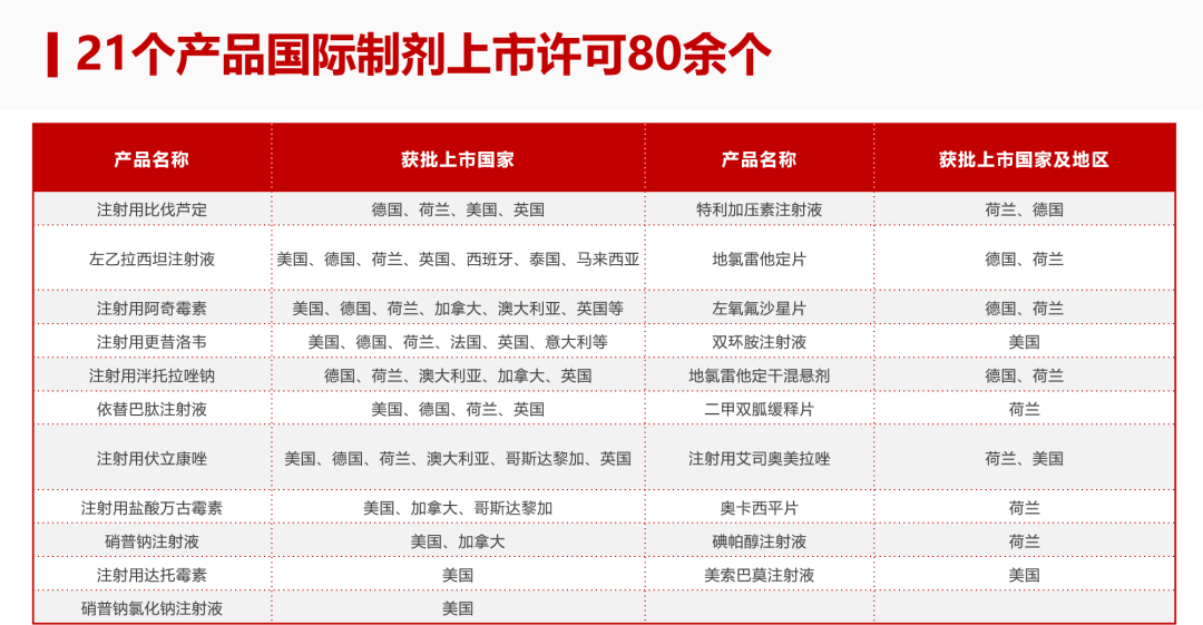 依托高标准质量管理以及高品质生产线,mg电玩娱乐在线网址已有16个针剂和5个口服共计21个产品先后获得多个国家和地区的上市许可80余个,其中13款产品还实现了在国外获批上市的同时,在国内通过或者视同通过仿制药一致性评价。