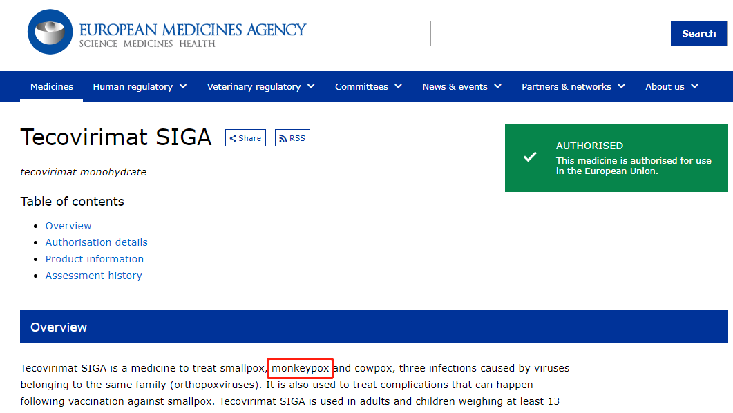 2022年,欧洲药品管理局(EMA)基于动物和人类的研究数据,批准了tecovirimat用于猴痘的治疗。