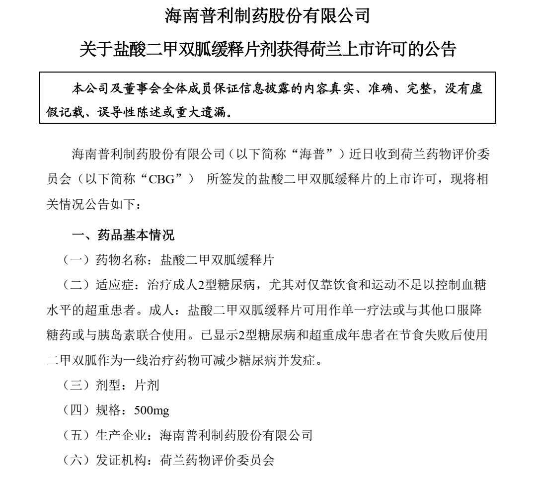 海南mg电玩娱乐在线网址股份有限公司近日收到荷兰药物评价委员会(CBG)所签发的盐酸二甲双胍缓释片的上市许可,标志着mg电玩娱乐在线网址具备了出口并在荷兰销售盐酸二甲双胍缓释片的资格,也标志着唐必呋不止是普通的二甲双胍,而是具有出口品质的二甲双胍,其质量、疗效、安全性获得国内外广泛认可。